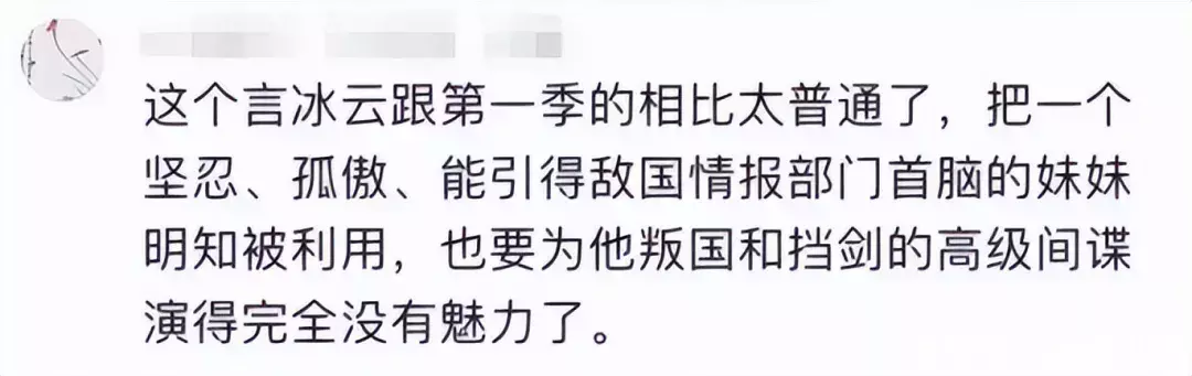 第一季上演言冰云的东说念主是肖战,其时肖战被大伙黑的可惨,合计他归附不出原著里言冰云的嗅觉,但出乎不雅众料想的是第二季换东说念主后,吴幸键的言冰云连肖战皆比不上,越换越差了。