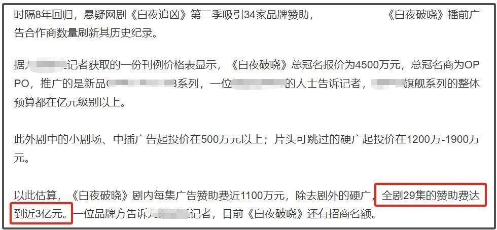 阐述《白夜追凶2》招商情况,媒体还算了一笔账——整部剧总冠名报价4500万,中插告白报价500万起,片头告白报价1000多万,剧集播出于今,每集牢固插入8个告白,官宣了31个品牌显现过半,保守揣测光告白收入就有3个亿。
